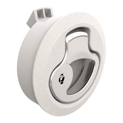 Push-to-Close Latch, Medium Size, Key Locking, 7 – 12 mm (.275-.475 in) Door thickness, 25.5 mm (1.00 in) Grip, Beige Plastic and 316 Stainless Steel, Natural and Electropolished