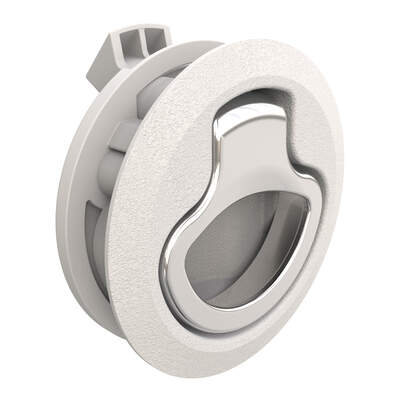 Push-to-Close Latch, Medium Size, No Restriction, 17 – 22 mm (.675-.875 in) Door thickness, 25.5 mm (1.00 in) Grip, Beige Plastic and 316 Stainless Steel, Natural and Electropolished