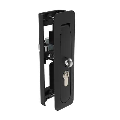 Multi-Point Compression Latch Actuator, Key Locking, with Padlock Hasp, DIN 18254 (Lock supplied), NEMA 4 / IP66 Sealed, 24 – 25.5mm (.94 – 1.00 in) Door thickness, Zinc alloy, Powder Coated, Black